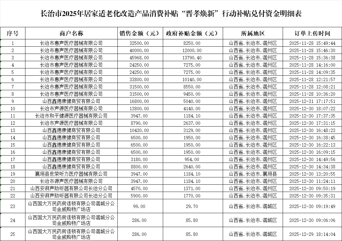附件:长治市2025年居家适老化改造产品消费补贴“晋孝焕新”行动补贴资金兑付明细表