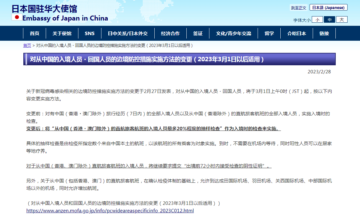 据日本驻华大使馆消息,自3月1日0时(日本时间)起,针对从中国大陆入境日本的人员不再实施全员落地检测,改为最大20%的样本抽查,并继续要求提供出国前72小时以内的核酸阴性证明。抽查人员不必等候检测结果,可自行入境。对从中国香港及澳门入境日本的人员,要求提供“出国前72小时以内的核酸阴性证明”或“疫苗接种三次证明”。