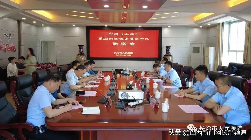 6月13日,长治市人民医院召开欢送援喀麦隆医疗队座谈会。长治市外事办副主任何诗涛、长治市卫健委副主任吴朝荣、长治市人民医院党委书记李俊、院长胡文庆,副院长陈贵月、陈锦华、周潞荣,7名援非医疗队员及相关职能科室和队员所在科室负责人参加了座谈会。会议由副院长周潞荣主持。