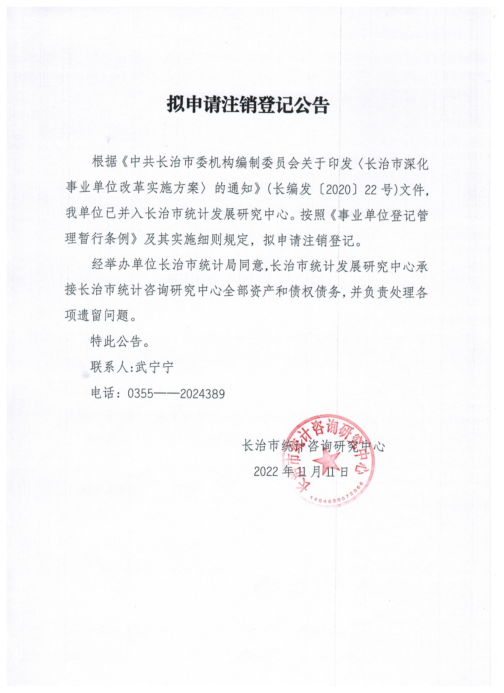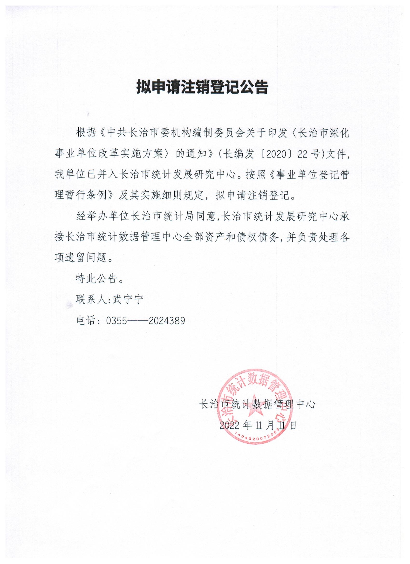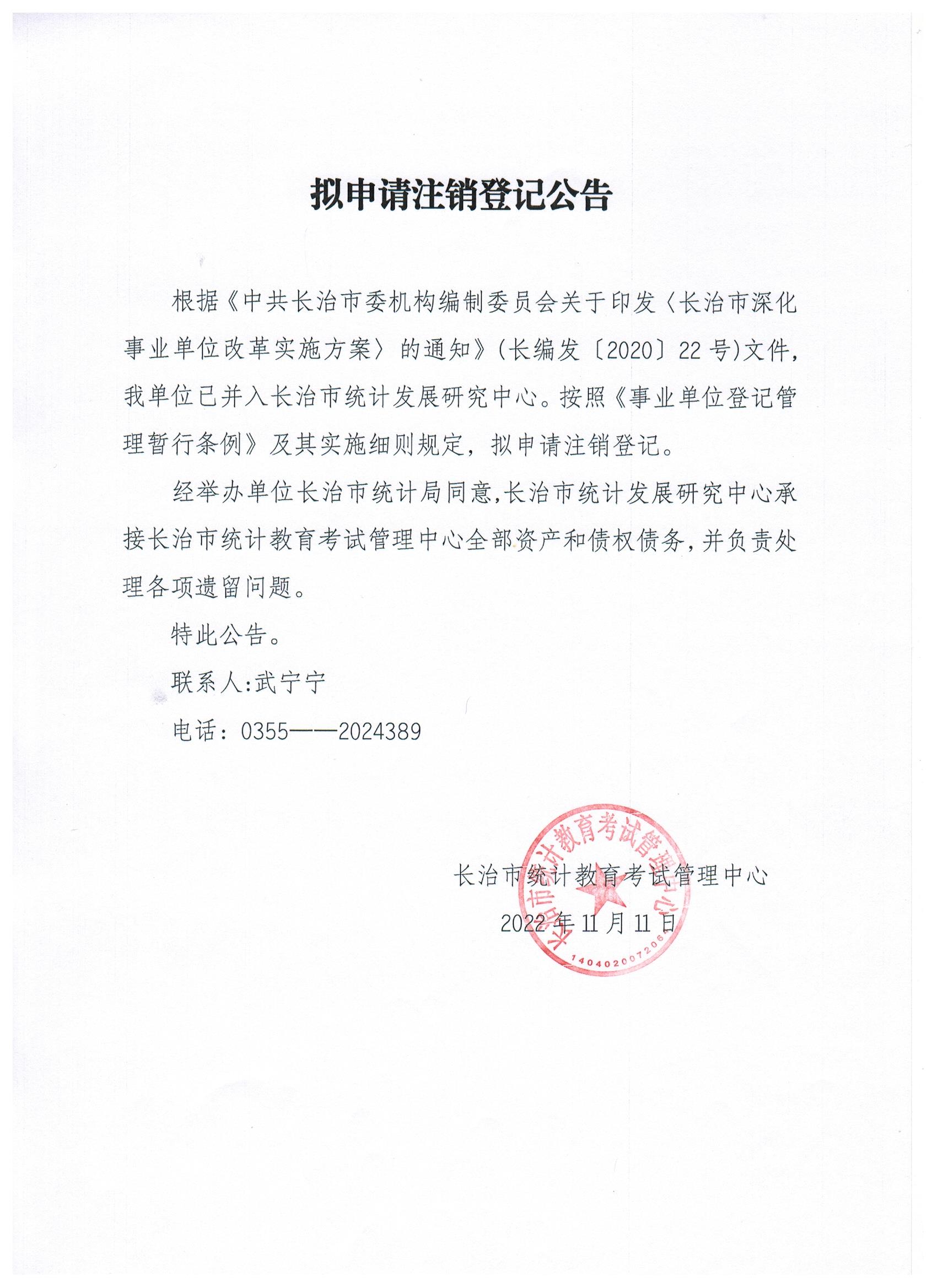 现有长治市统计教育考试管理中心、长治市统计数据管理中心等11家事业单位法人申请注销登记,现发布其拟申请注销登记公告。