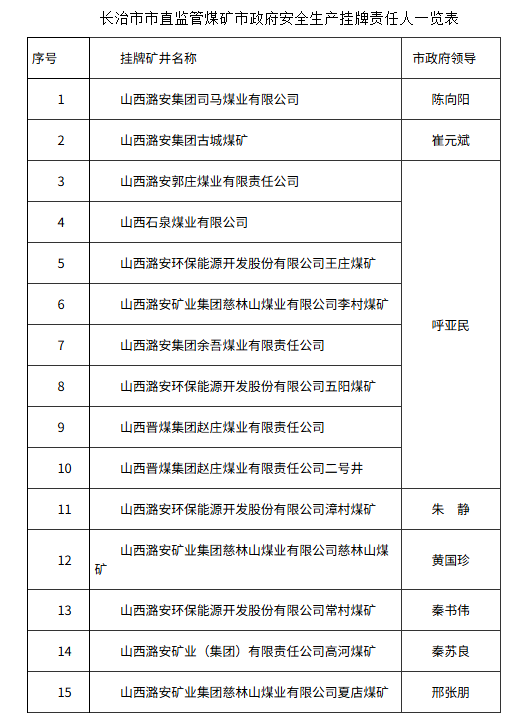 附件:长治市市直监管煤矿市政府安全生产挂牌责任人一览表