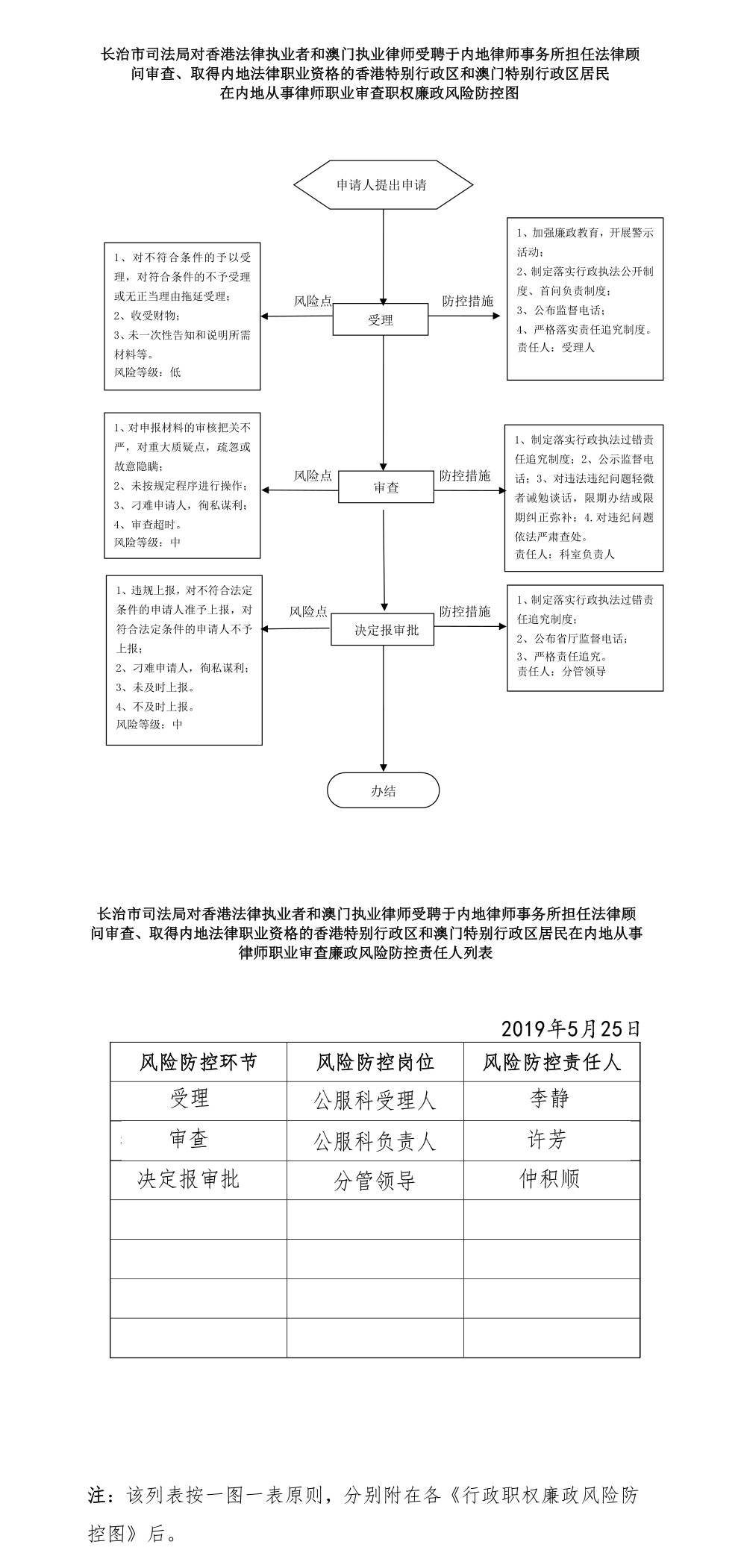 长治市司法局对香港法律执业者和澳门执业律师受聘于内地律师事务所担任法律顾问审查、取得内地法律职业资格的香港特别行政区和澳门特别行政区居民 在内地从事律师职业审查职权廉政风险防控图