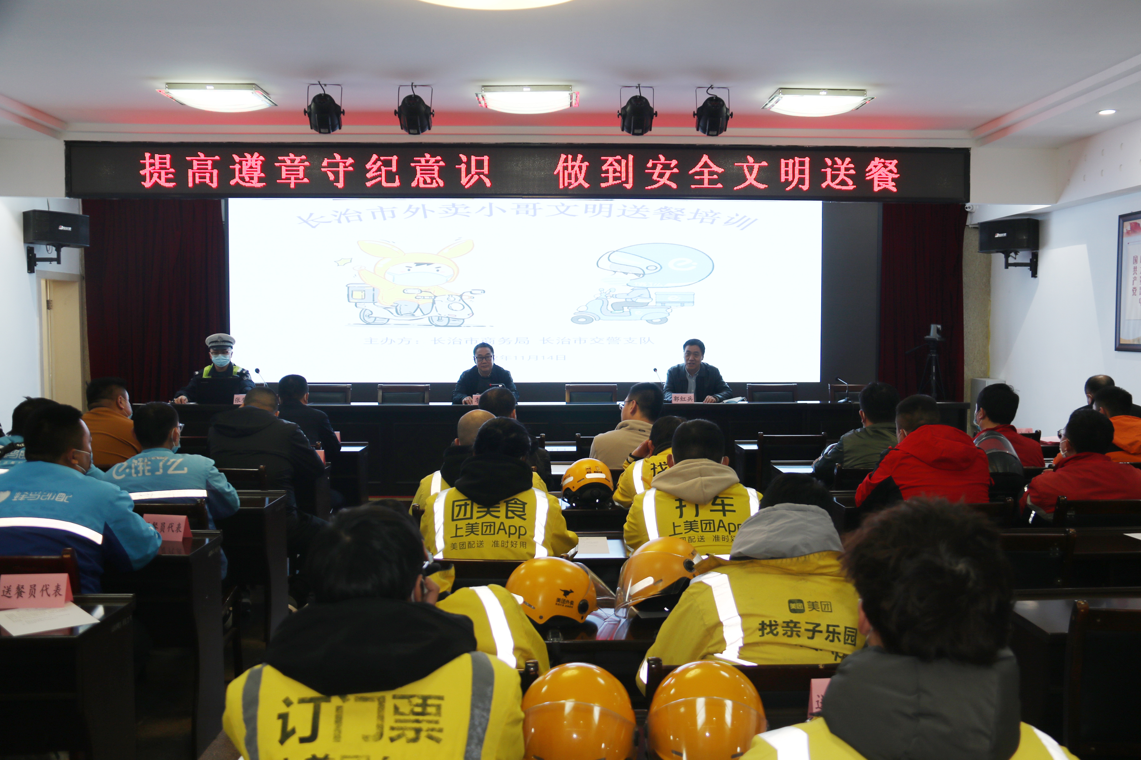 11月14日,为配合我市文明创建工作,规范外卖送餐行为,长治市商务局联合市交警支队召开外卖送餐人员文明送餐培训会。参会人员包括美团、饿了么、曹操到、肯德基、闪送、市餐饮协会等企业负责人和骑手代表。