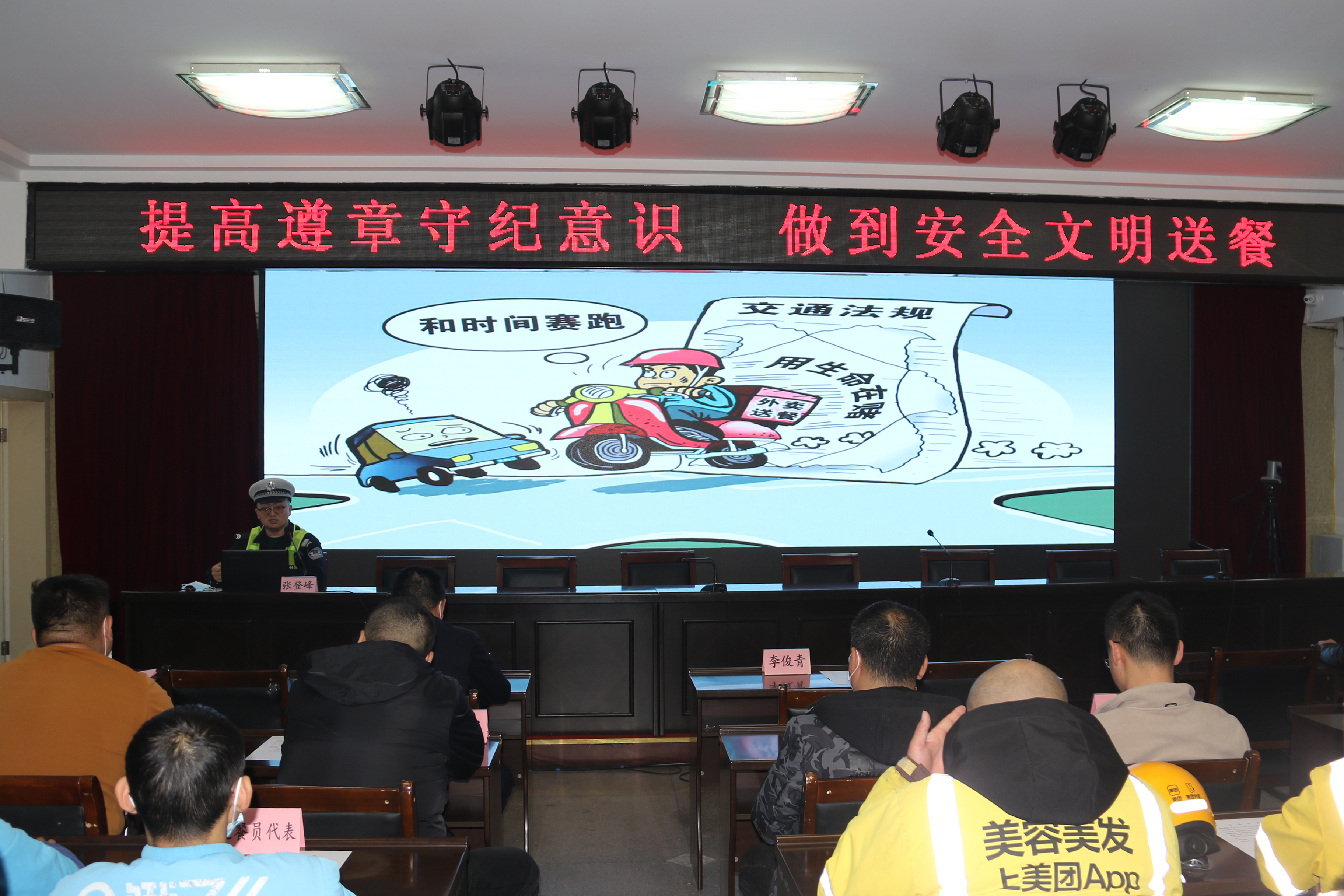 会议上,市交警支队张登峰警官就交通安全知识以及超速超载、闯红灯等严重交通违法行为的危害性和处罚措施进行了授课讲解,针对近两年来外卖送餐主要违章行为及严重后果做了强调,对遵章守纪和文明送餐提出了要求。