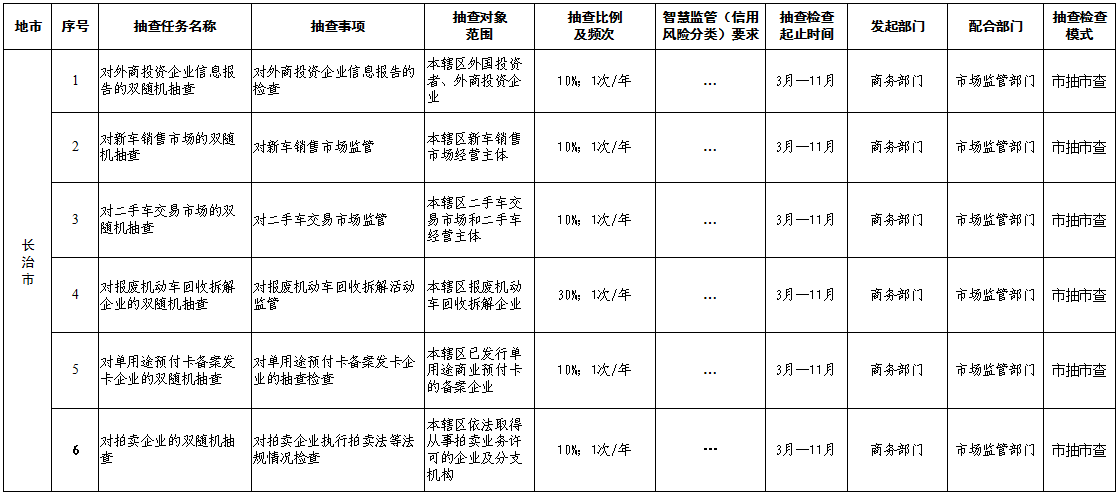长治市商务局2026年度部门联合双随机抽查工作计划 (“一业一查”部门联合双随机抽查工作计划)