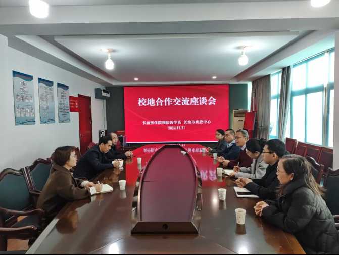 2024年11月21日,长治市疾控中心(市卫生监督所)在国策大厦四楼会议室召开校地合作交流座谈会。长治医学院公共卫生与预防医学系主任杨建洲,副主任饶华祥、翟艳丽和教研室教师,市疾控中心党总支书记、主任原超普,中心党总支委员、副主任张维民及相关科室负责人参加。