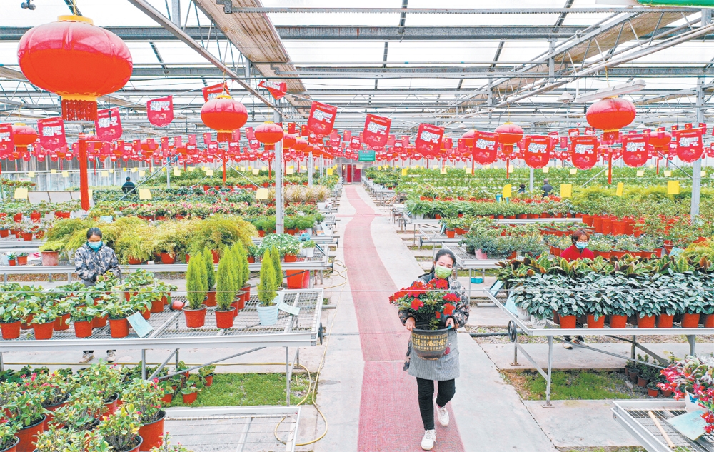 12月26日,上党区东贾村红都生态种植专业合作社花卉种植基地,花农正在温控大棚内作业。 记者 司敏 摄