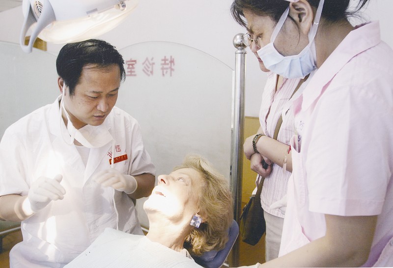 秦晓中(左一)正在为一位美籍教师做牙健康检查。